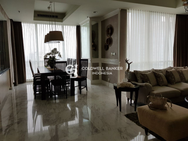 Dijual Apartemen The Peak Sudirman, Tower Regis dengan luas 232 m2, terdiri dari 3 kamar tidur, 2 kamar mandi, dan maid area. Unit terletak di lantai 42 dan sudah dalam kondisi fully furnished.